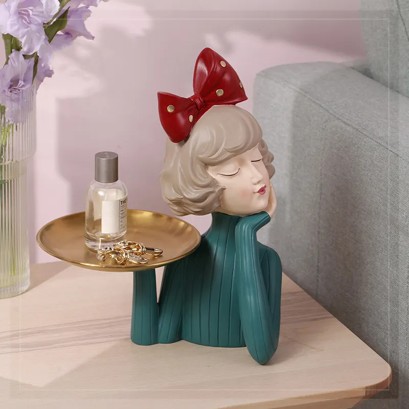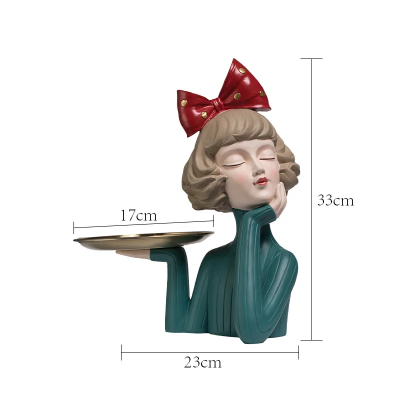 Are you tired of cluttered entrance tables or counters? Do you struggle to find a convenient and chic way to store your keys, snacks, or small ornaments? Our Modern Bow Girl Statue is the perfect solution for all your storage and decorative needs.