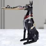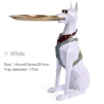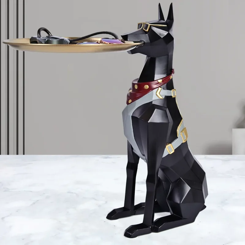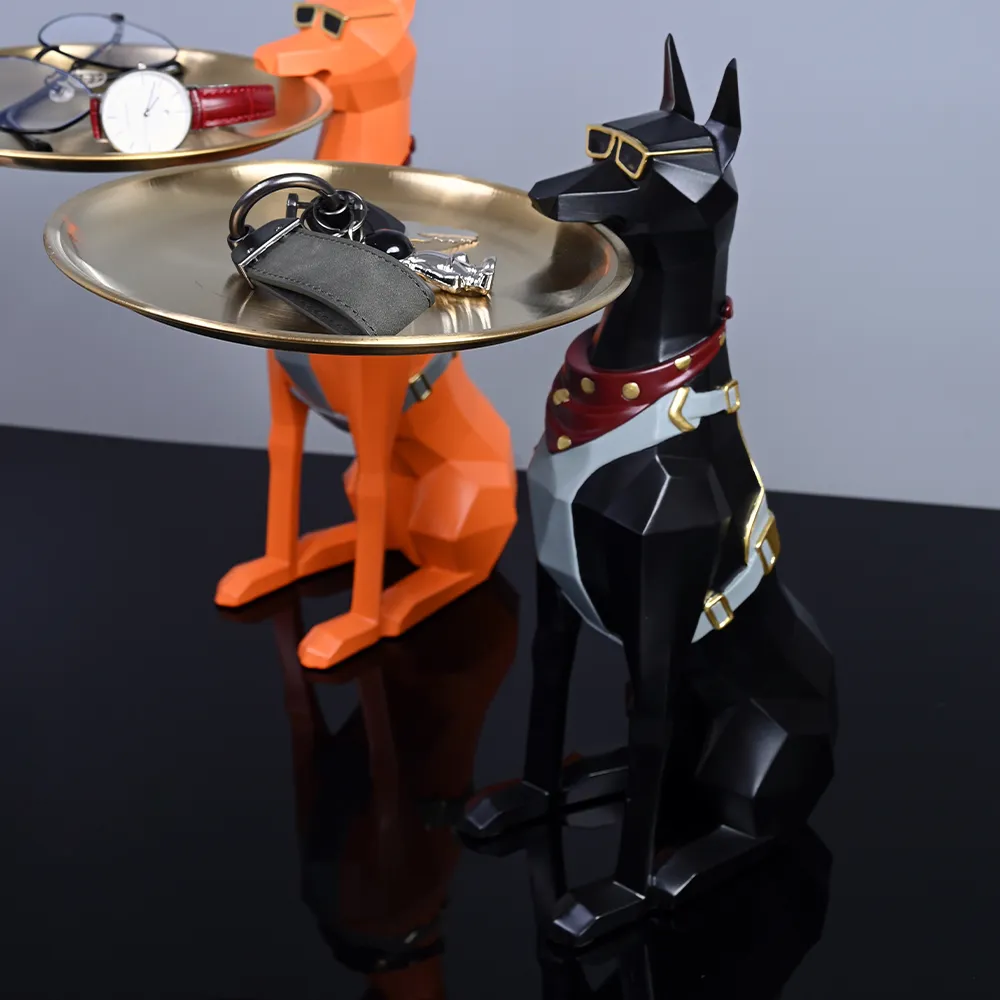 Introducing the Resin Art Dog Statue Butler with Tray for Keys Jewelry Holder Doberman Pinscher Sculptures Living Room Decoration Table Ornament. This elegant and versatile piece will not only add a touch of charm to your living space but also serve as a functional solution to keep your keys and jewelry items organized and easily accessible.